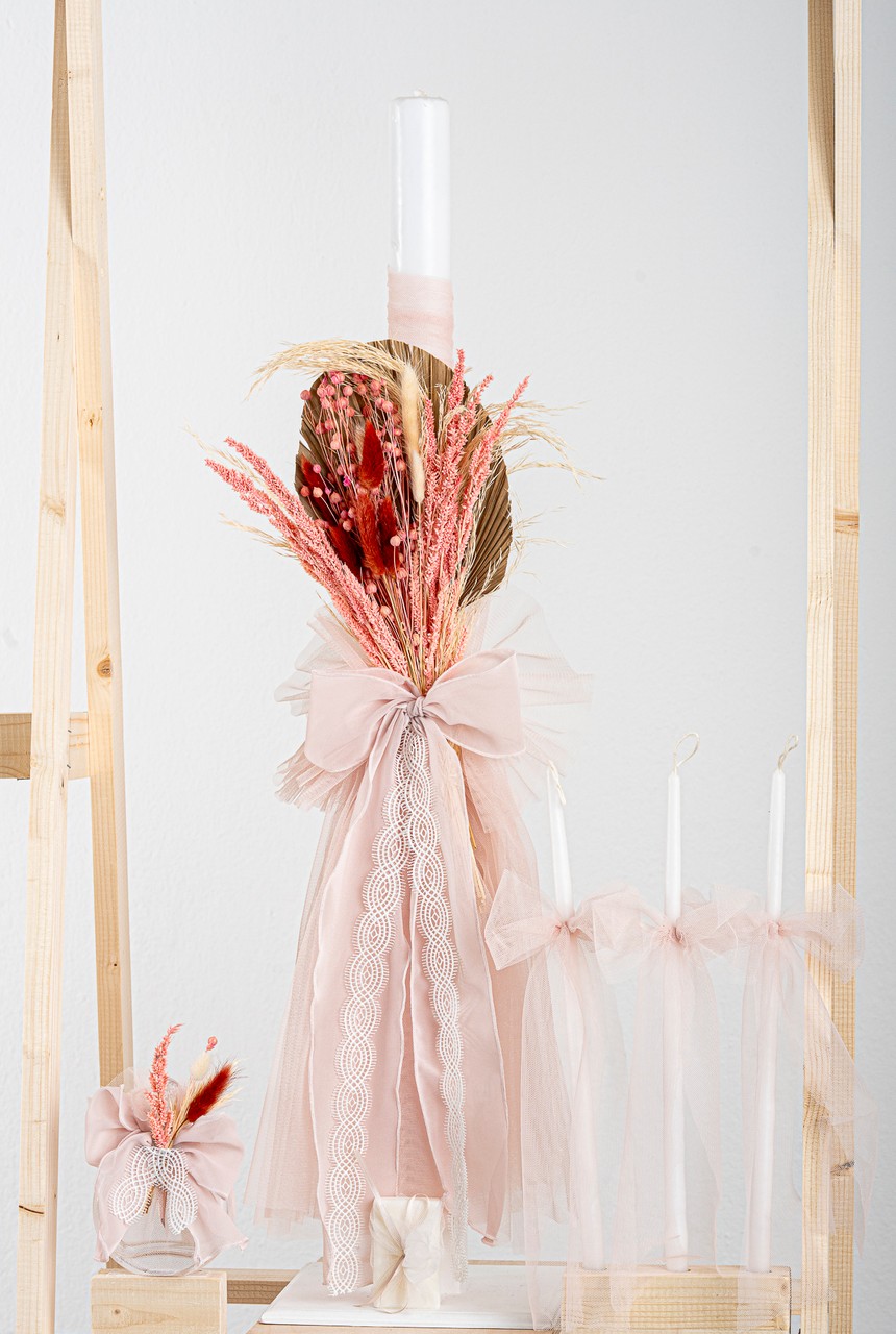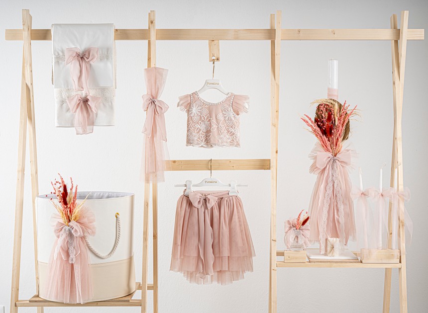 Βαπτιστικό πακέτο Piccolino Isabelle powder περιλαμβάνει φόρεμα ,σετ λαδόπανα, λαμπάδα, λαδοσετ και στολισμένo καλάθι