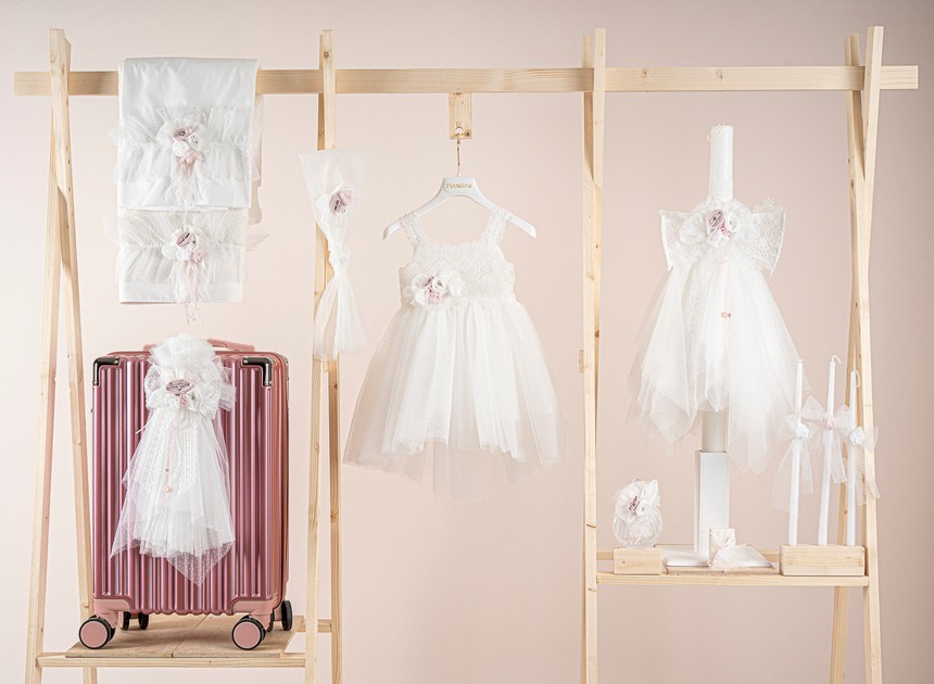 Βαπτιστικό πακέτο Piccolino Matylda ivory περιλαμβάνει φόρεμα ,σετ λαδόπανα, λαμπάδα, λαδοσετ και στολισμένη βαλίτσα puce