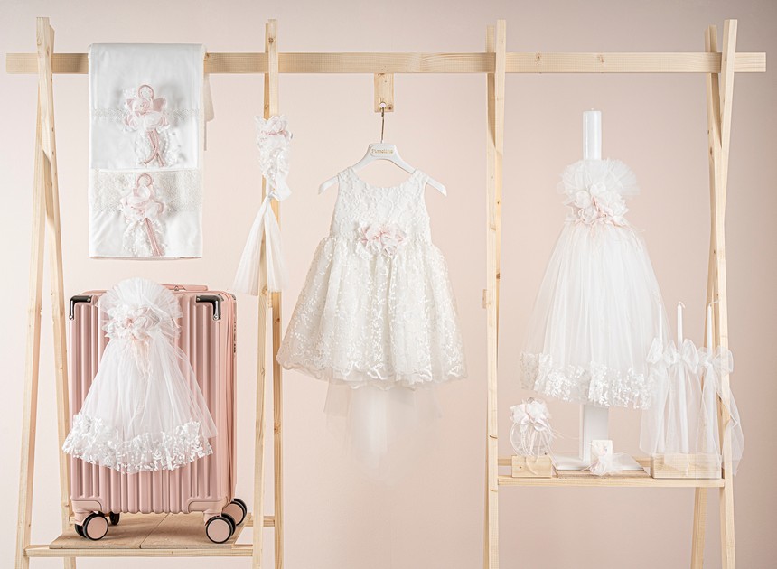 Βαπτιστικό πακέτο Piccolino Michele ivory περιλαμβάνει φόρεμα ,σετ λαδόπανα, λαμπάδα, λαδοσετ και στολισμένη βαλίτσα pink