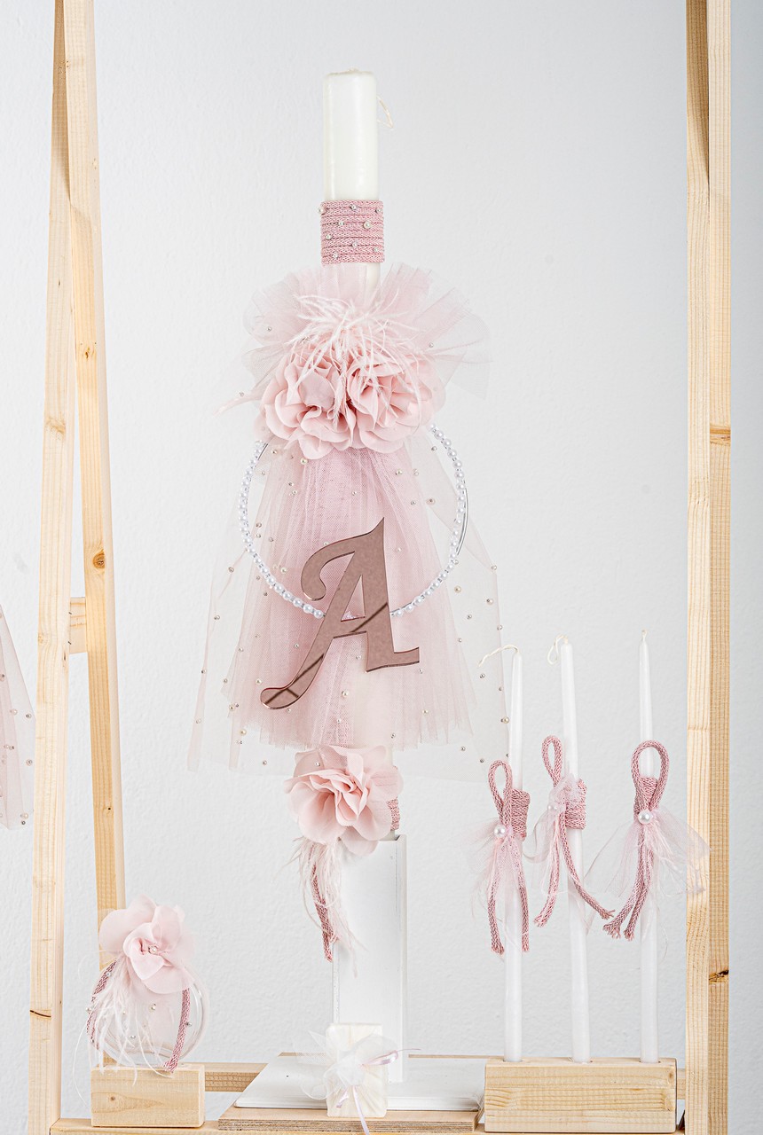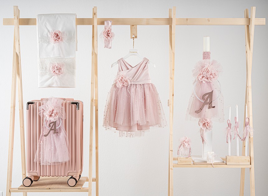 Βαπτιστικό πακέτο Piccolino Zoe pink περιλαμβάνει φόρεμα ,σετ λαδόπανα, λαμπάδα, λαδοσετ και στολισμένη βαλίτσα pink