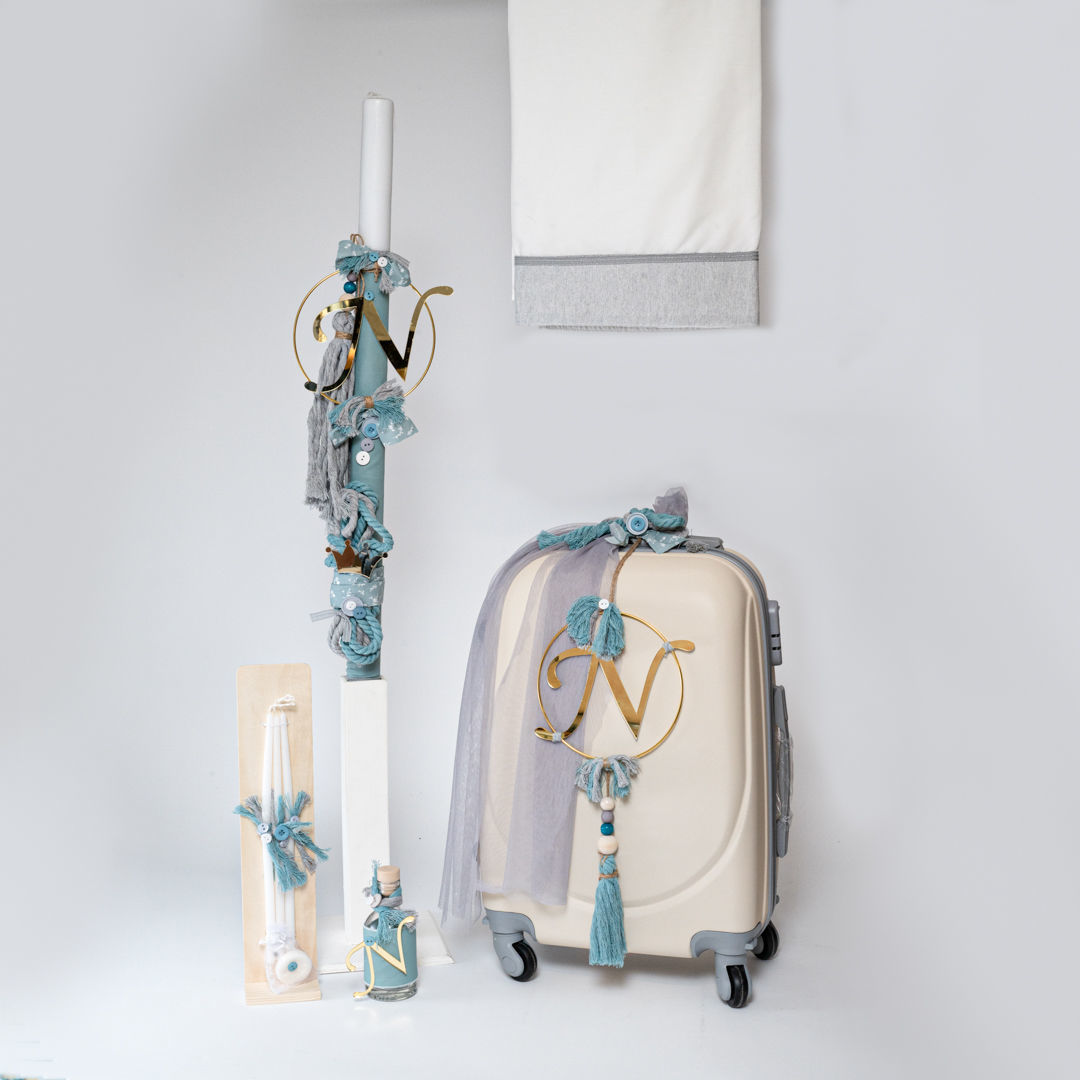 Στις αποχρώσεις του βεραμάν και του γκρι αυτό το σετ έχει θέμα το χρυσό πλέξιγκλας μονόγραμμα σε χρυσό στεφάνι.