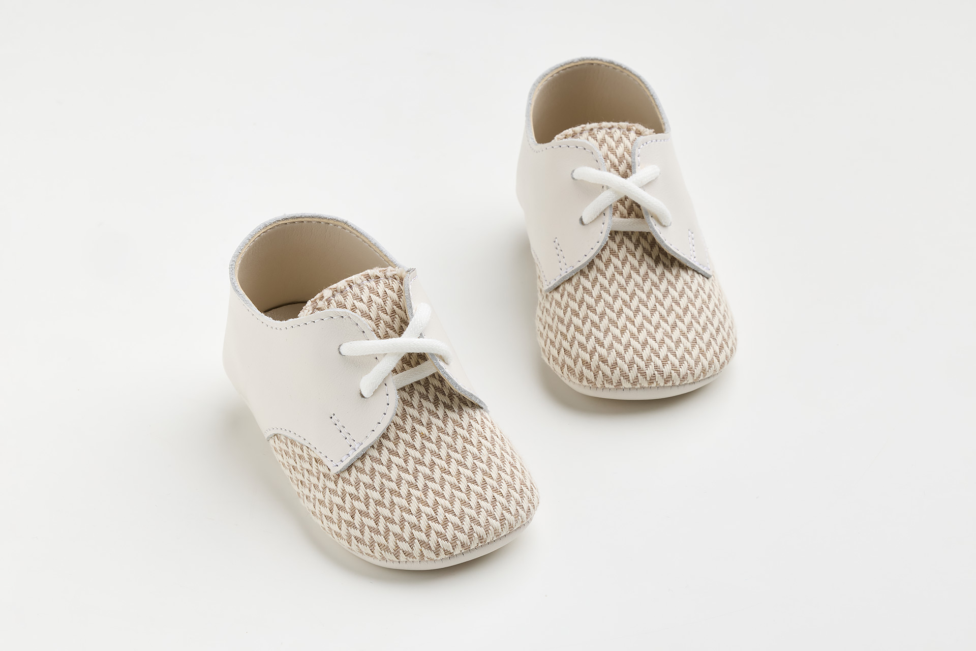 παπουτσάκι αγκαλιάς σε εκρού λείο δέρμα και ύφασμα με μοτίβο