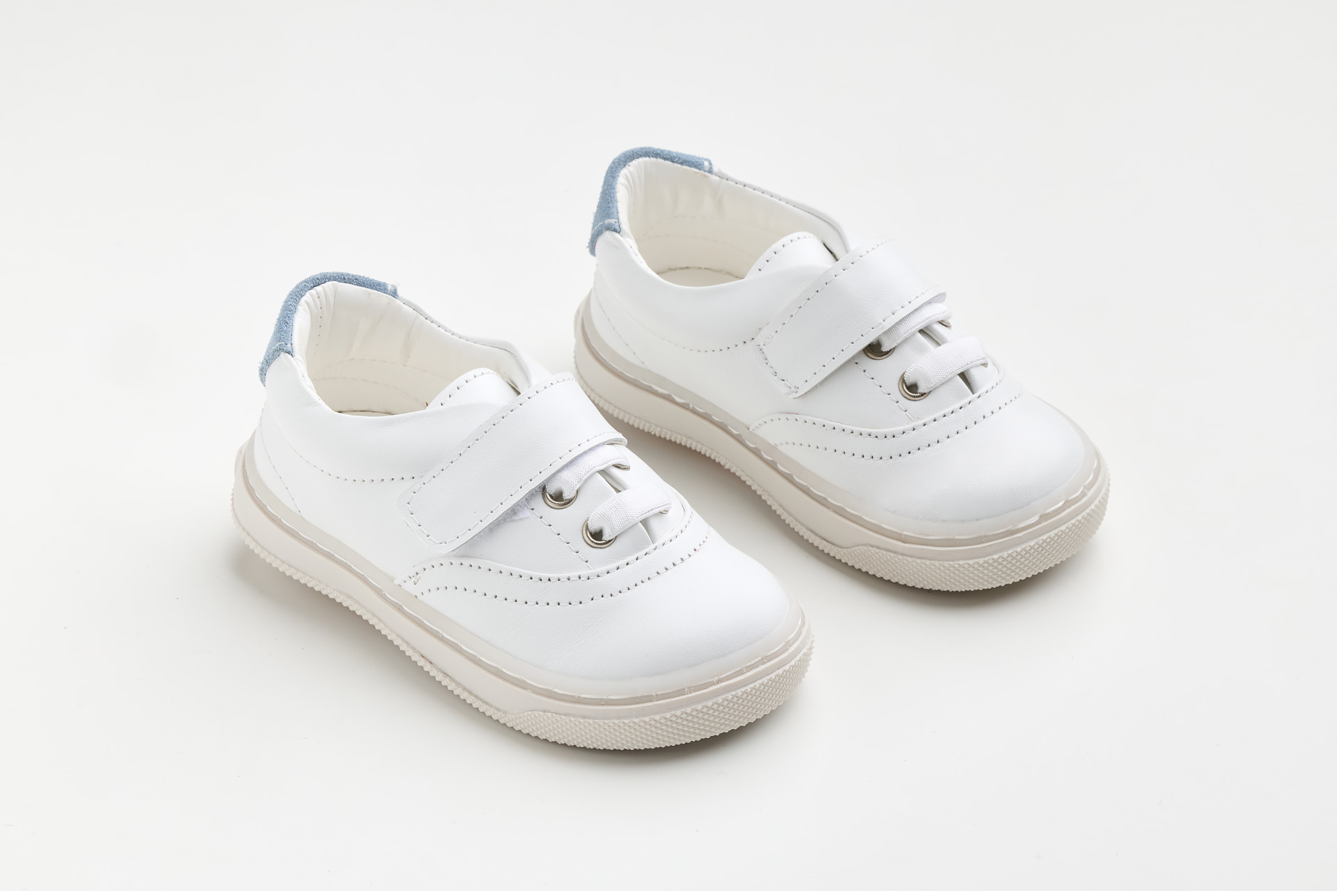 A629A - παπουτσάκι περπατήματος σε λευκό λείο δέρμα, γαλάζιο καστόρ δέρμα και κλείσιμο με ελαστικό κορδόνι και Velcro