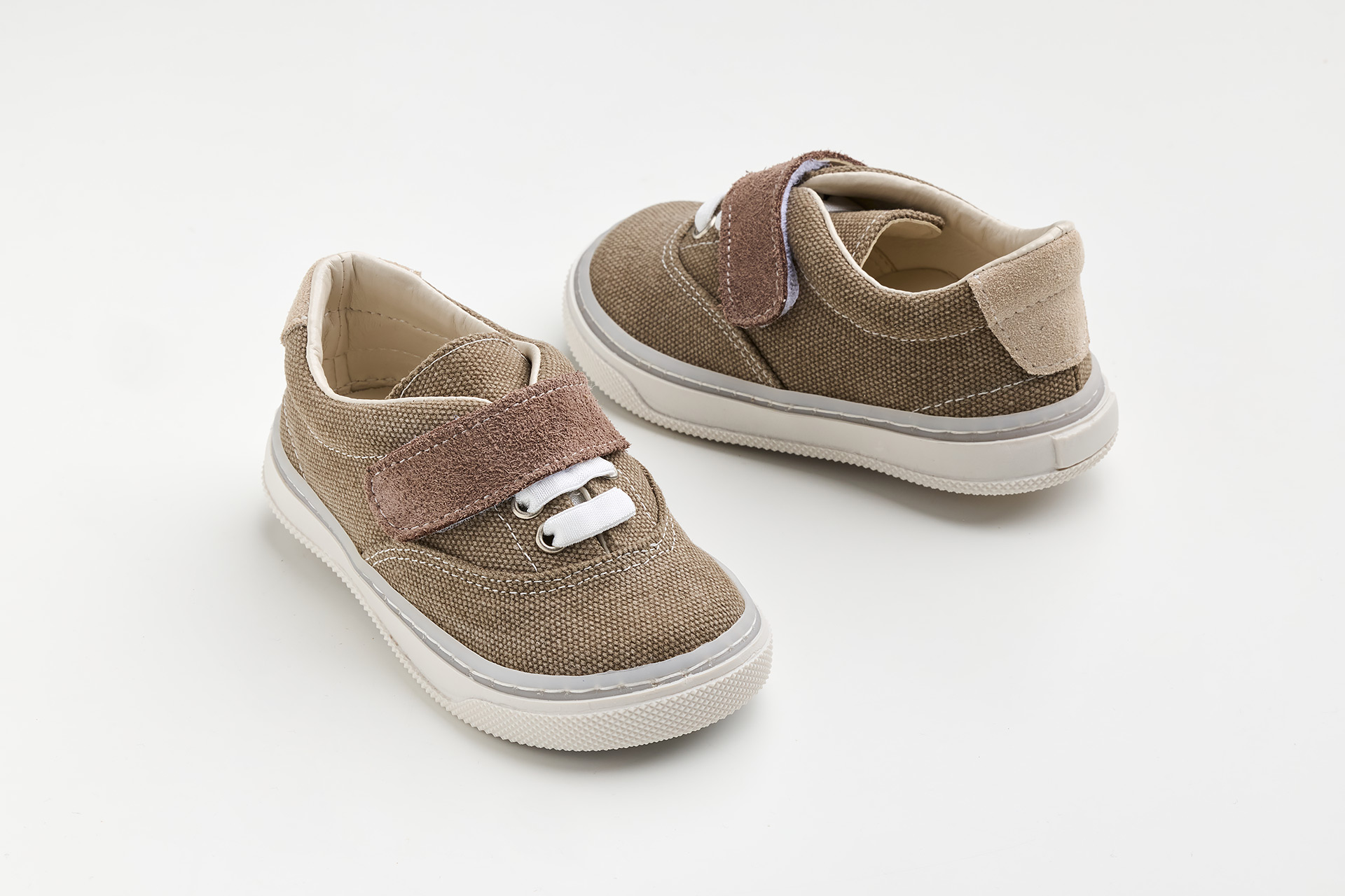 παπουτσάκι περπατήματος σε καφέ/πούρο ύφασμα, πούρο και μπεζ καστόρ δέρμα και κλείσιμο με ελαστικό κορδόνι και Velcro