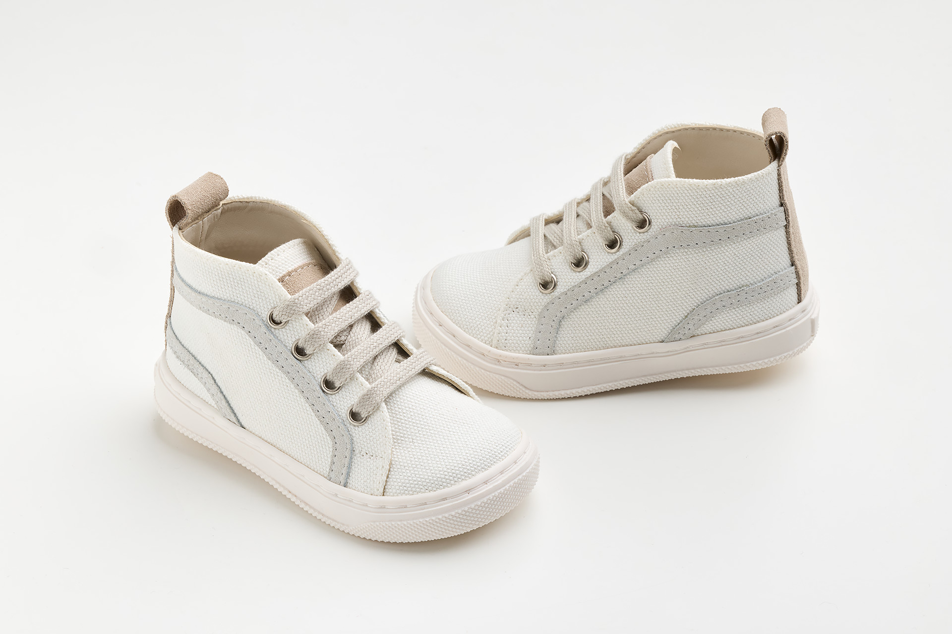 A633A - μποτάκι περπατήματος σε λευκό ύφασμα και λεπτομέρεια από μπεζ και λευκό καστόρ δέρμα