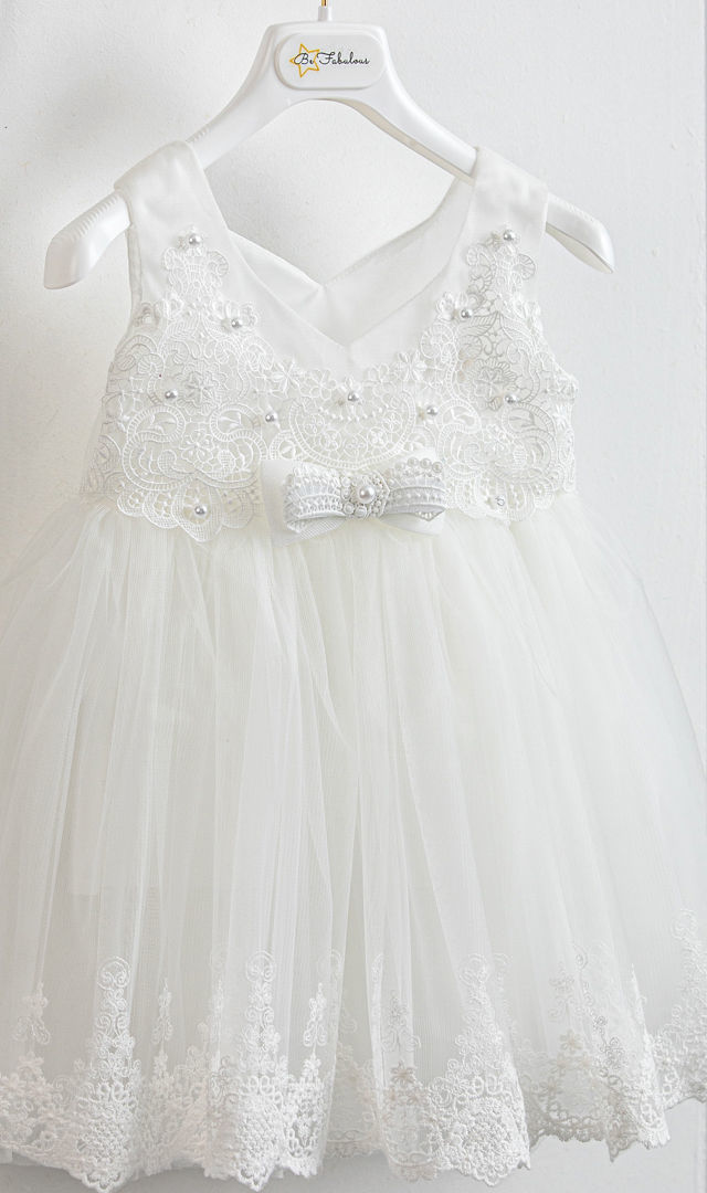 Βαπτιστικό φόρεμα BE FABULOUS DONA-IVORY από την Piccollino σε εκρού απόχρωση. Μπούστο από δανδέλα κεντημένο με πέρλες και λαιμόκοψη σε σχήμα καρδιάς. Η φούστα είναι τούλινη με τελείωμα δαντέλας. Τη μέση κοσμεί ένα πανέμορφο φιογκάκι από δαντέλα και πέρλα.
