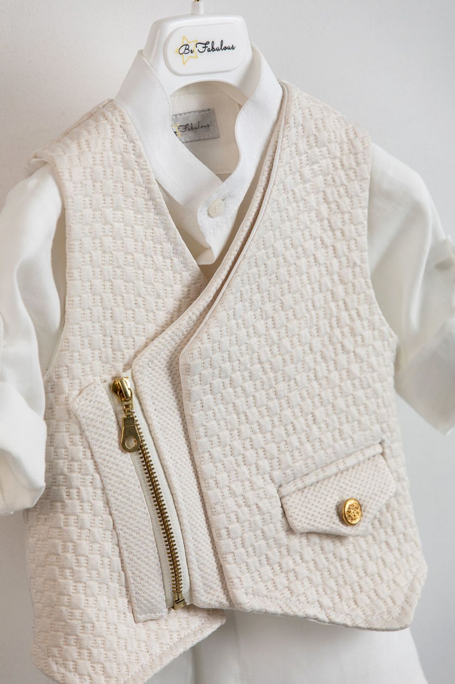 Περιλαμβάνει γιλέκο με ιδιαίτερο κόψιμο σε ιβουάρ χρώμα με φερμουάρ σε χρυσή απόχρωση και χρυσό διακοσμητικό κουμπί στο τσεπάκι ,λινό πουκάμισο ιβουάρ με μάο γιακά,  λινό παντελόνι με πιέτες ιβουάρ, ζώνη και καπέλο με φάσα.