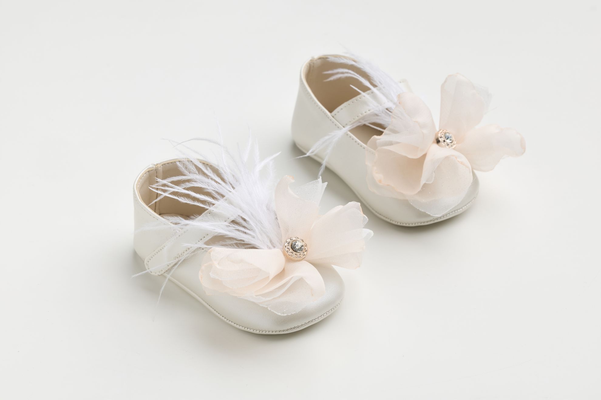K609E - Μπαλαρίνα αγκαλιάς εκρού τεχνόδερμα με χειροποίητο διακοσμητικό σε σομον και off white φτερό