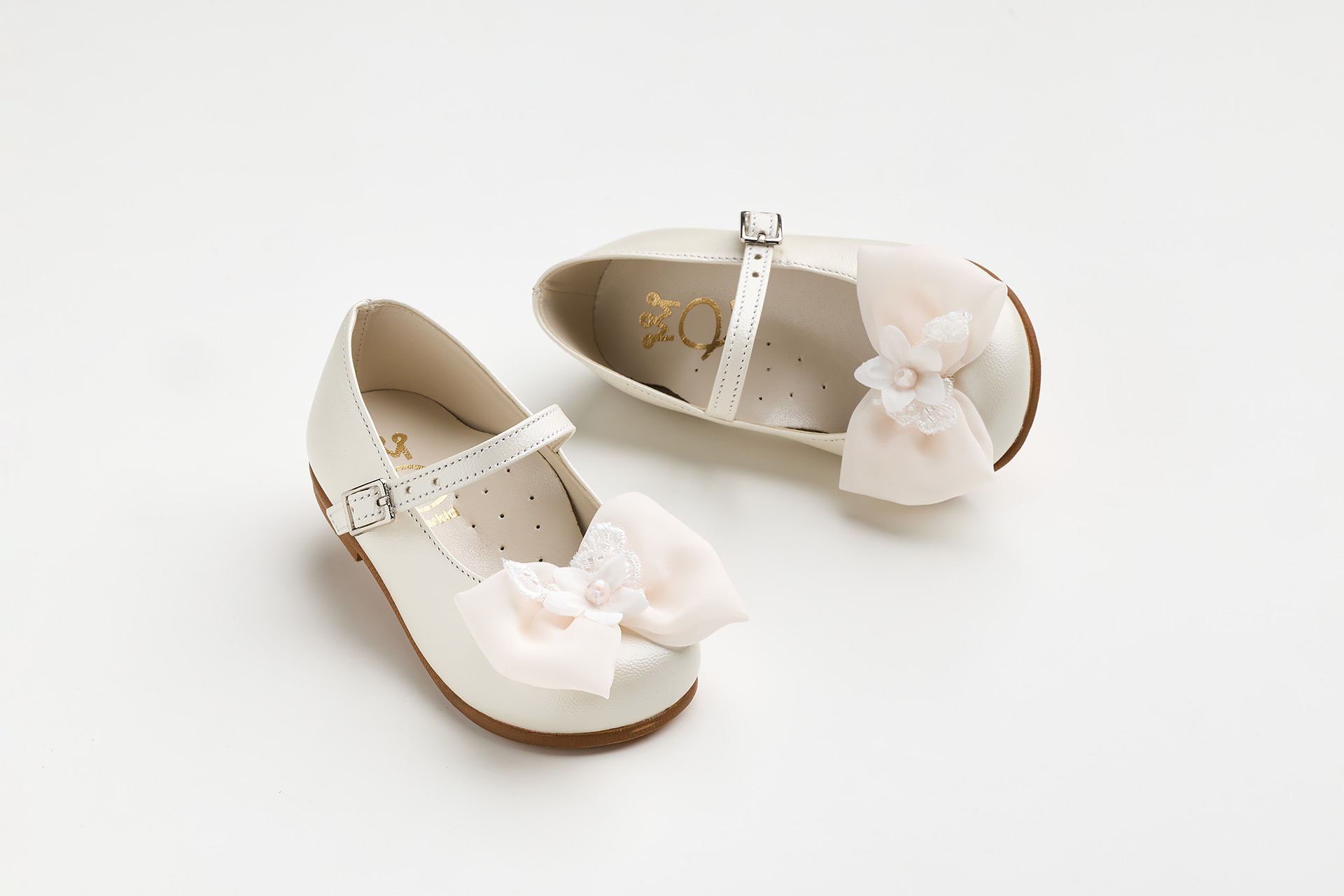 K6114E - Μπαλαρίνα περπατήματος σε εκρού δέρμα με χειροποίητο σομον φιόγκο από μουσελίνα