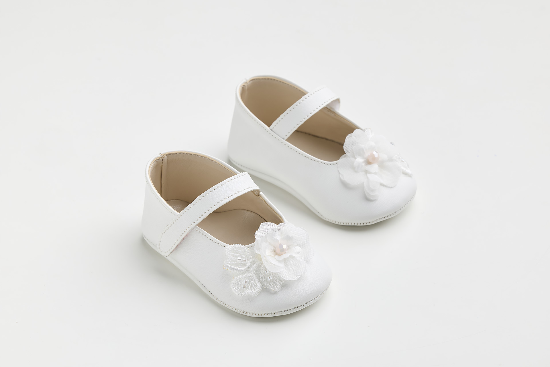 K611A - Μπαλαρίνα αγκαλιάς σε λευκό τεχνόδερμα με χειροποίητο διακοσμητικό λουλούδι