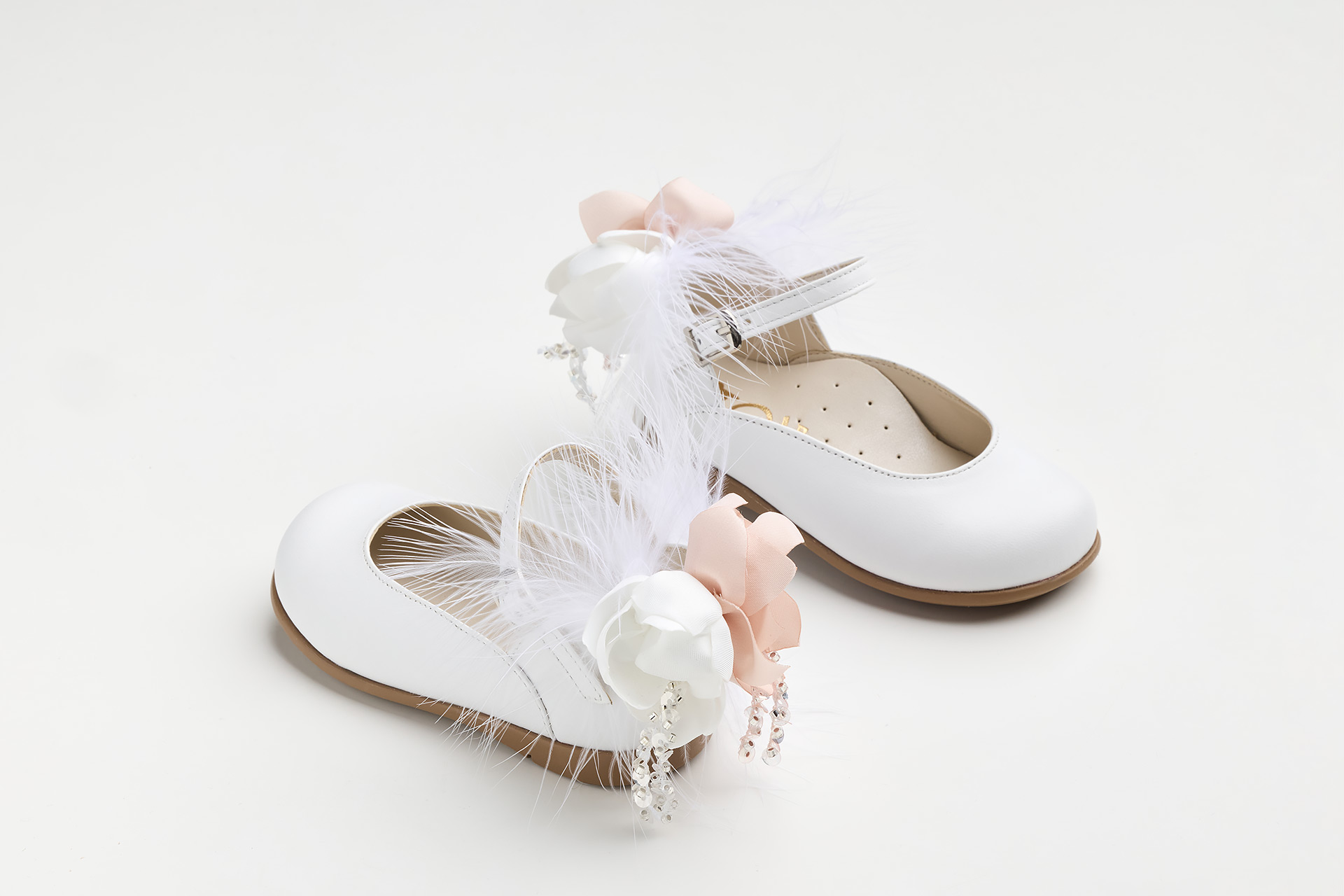 K6120A - Μπαλαρίνα περπατήματος σε λευκό δέρμα με χειροποίητο διακοσμητικό με off white και dusty pink συνθεση λουλουδιών