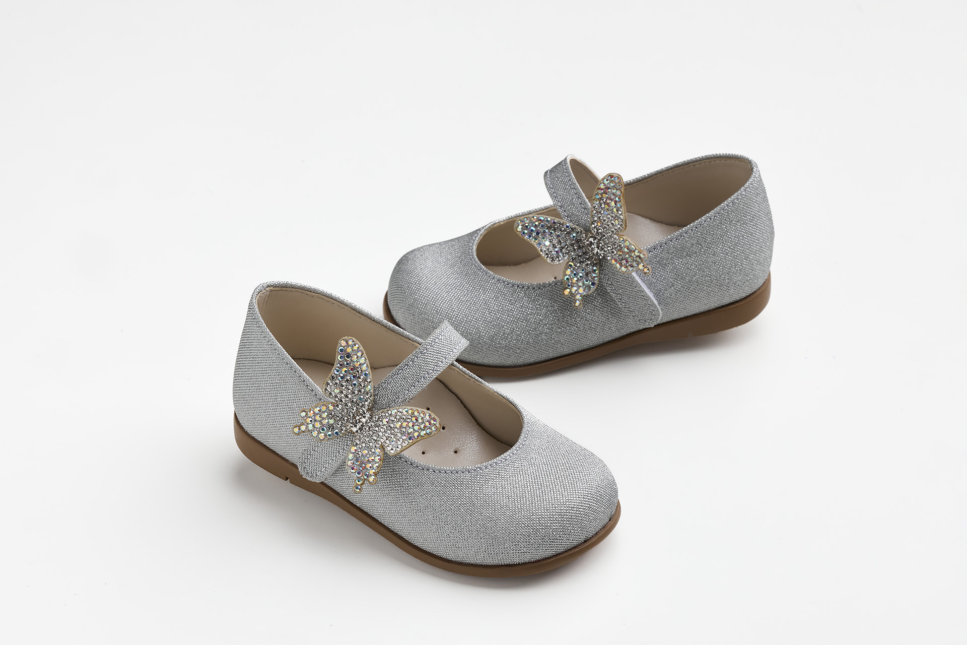 K6121A - Μπαλαρίνα περπατήματος σε ασημί γκλιτερ με στρας πεταλούδα