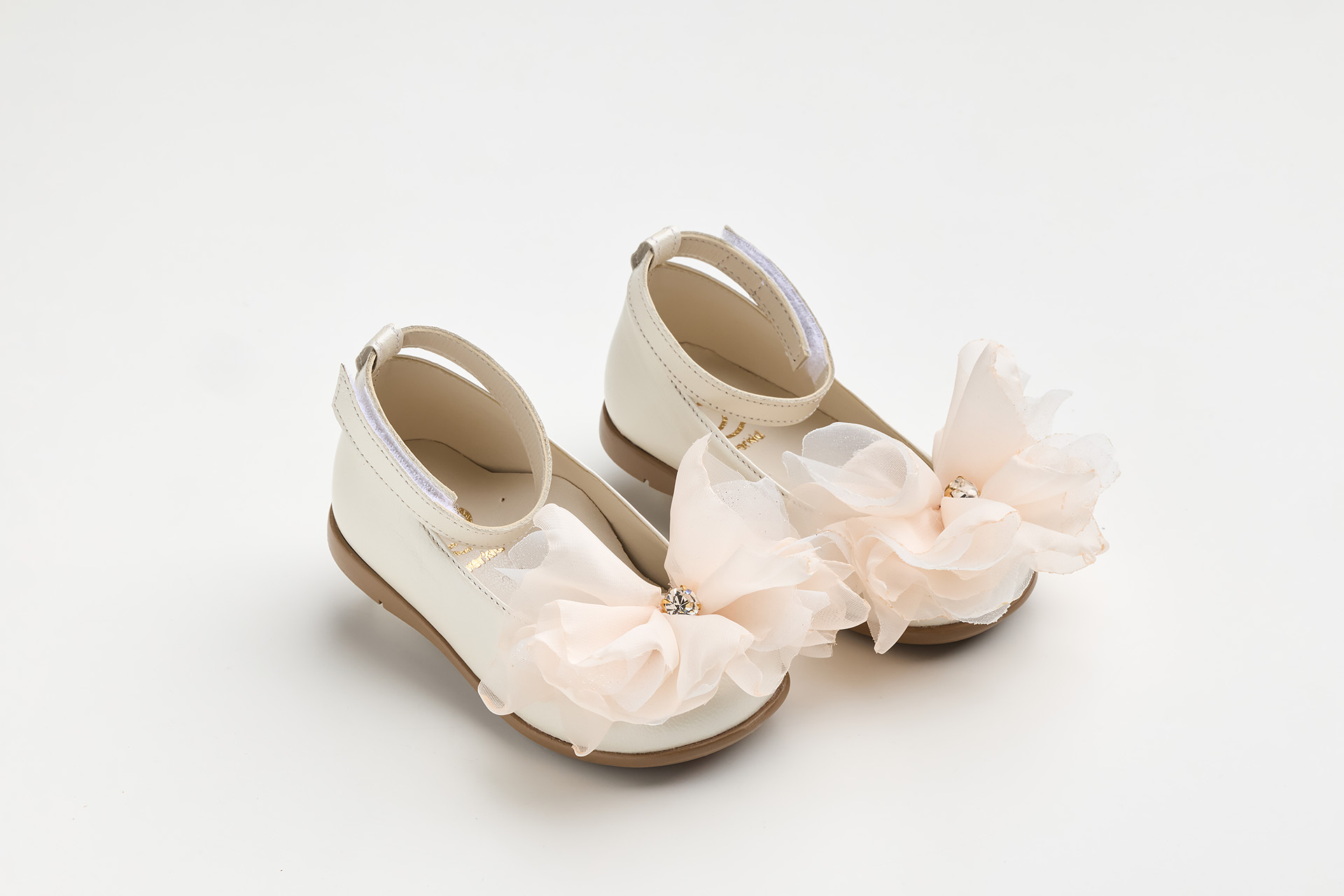 Μπαλαρίνα περπατήματος σε εκρού δέρμα με χειροποίητο διακοσμητικό από σομον μουσελίνα και στρας