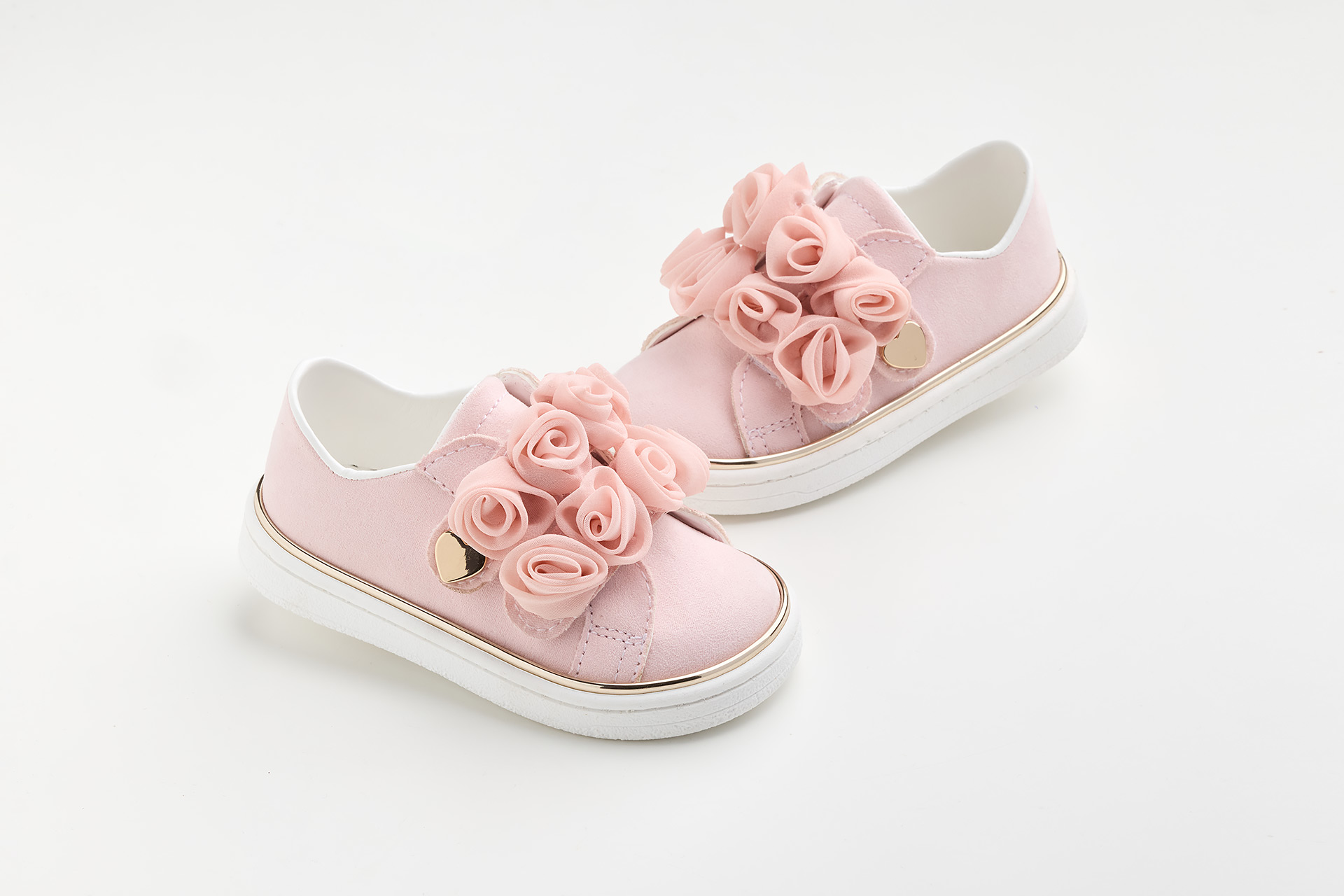Sneaker περπατήματος σε ροζ συνθετικό καστορ με χειροποίητα ροζ τριαντάφυλλα από μουσελίνα