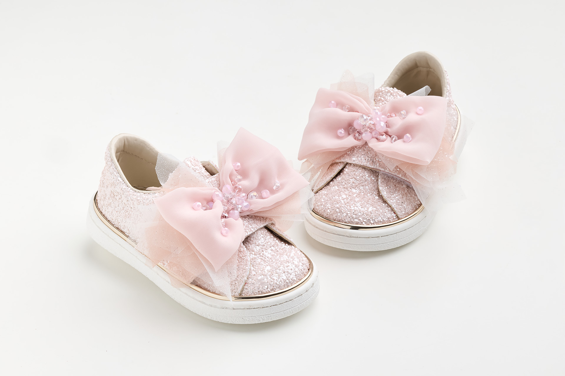 Sneaker περπατήματος σε ροζ ματ γκλιτερ με χειροποίητο ροζ φιόγκο από μουσελίνα
