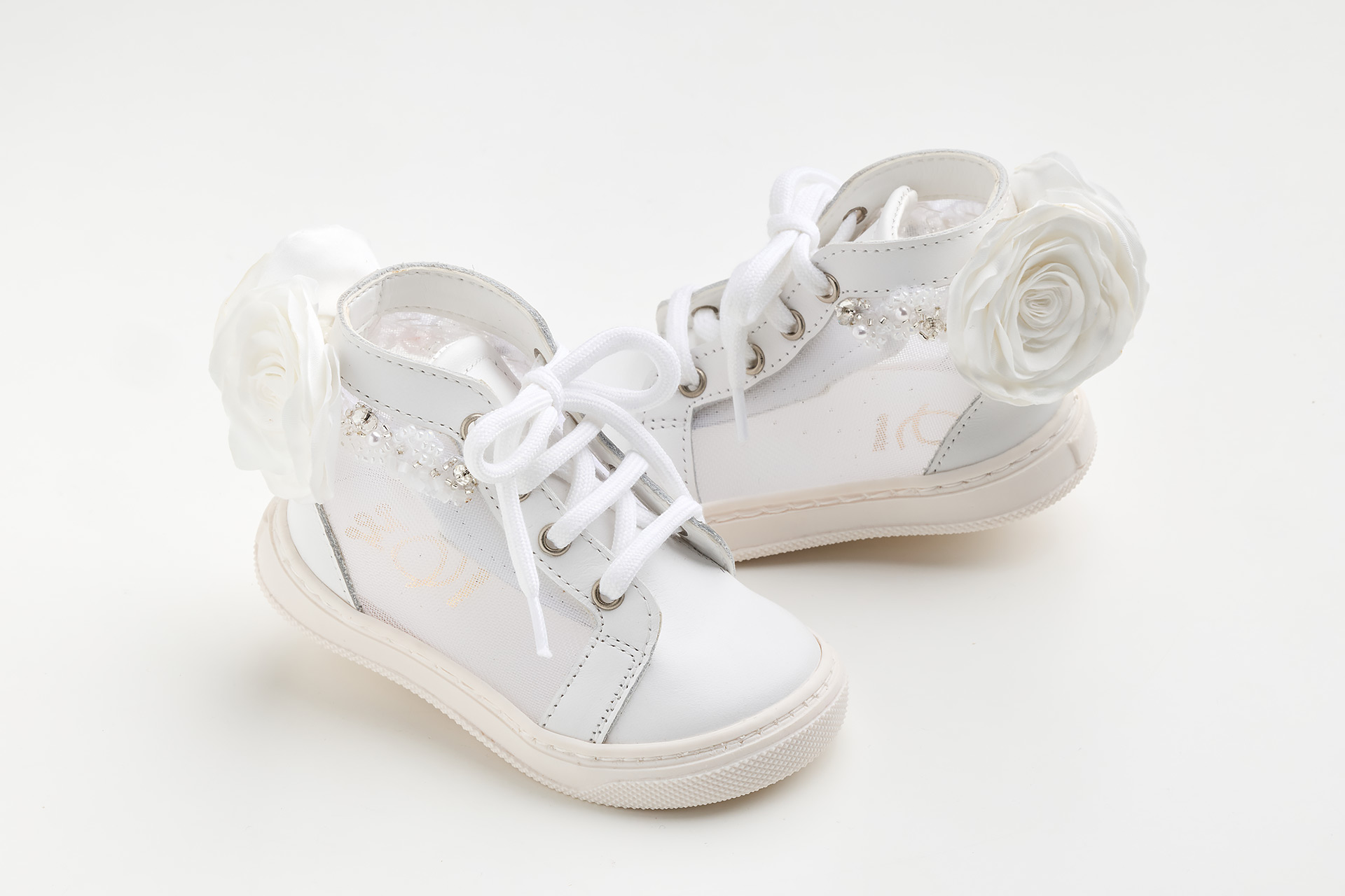 Μποτάκι περπατήματος σε λευκό δέρμα και διαφάνεια, διακοσμημένο με χειροποίητα τριαντάφυλλα και κεντημένο με πέρλες και στρας