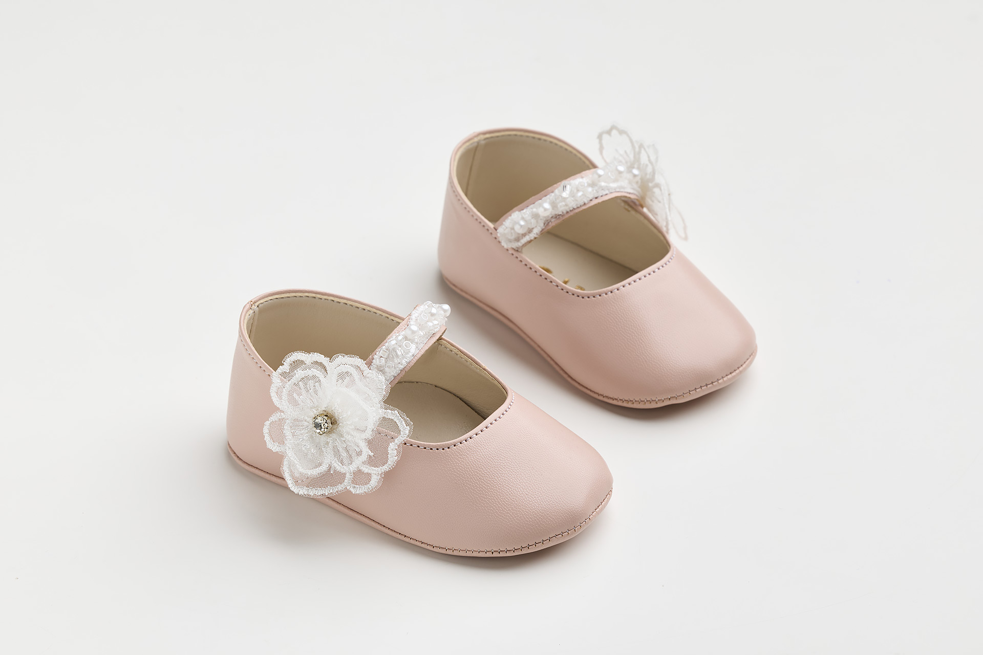 K614P - Μπαλαρίνα αγκαλιάς σε ροζ τεχνόδερμα με χάντρες, πέρλες και off white κεντητό λουλούδι με στρας