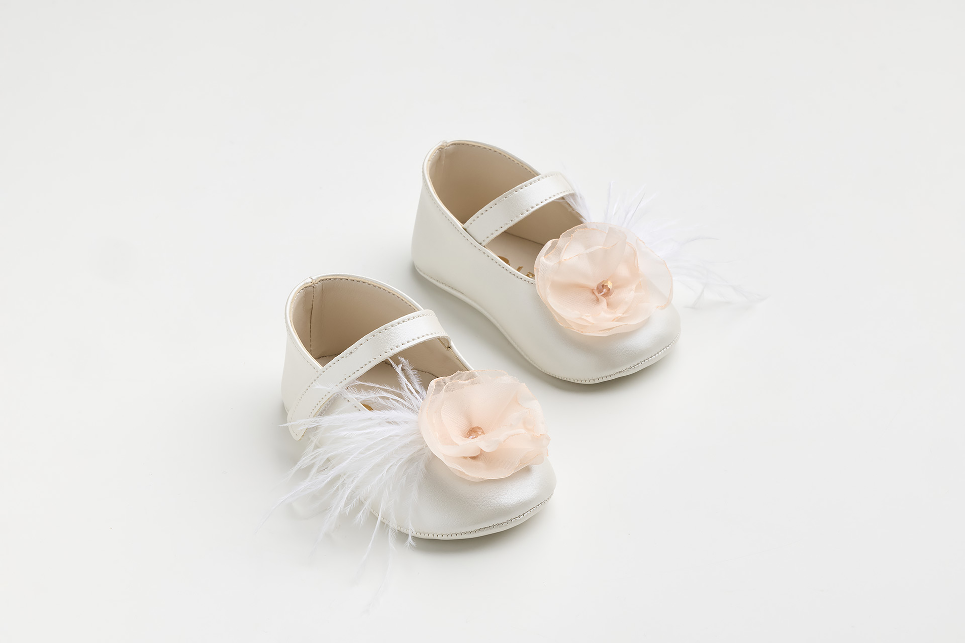K618B - Μπαλαρίνα αγκαλιάς σε εκρού τεχνόδερμα με χειροποίητο σομον λουλούδι και φτερά