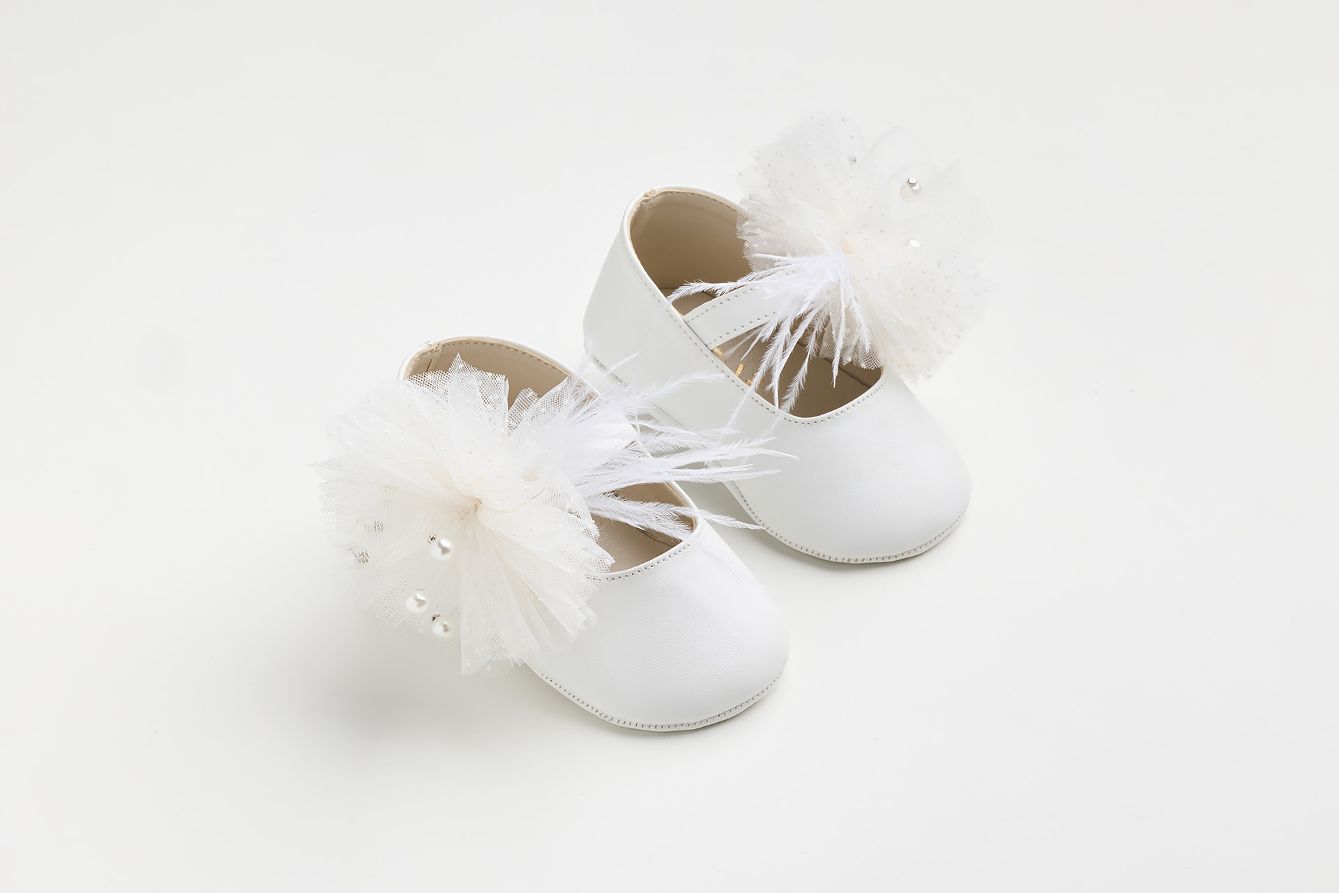 K619A - Μπαλαρίνα αγκαλιάς σε λευκό τεχνόδερμα με χειροποίητο διακοσμητικό από off white πουα τούλι πέρλες και φτερά