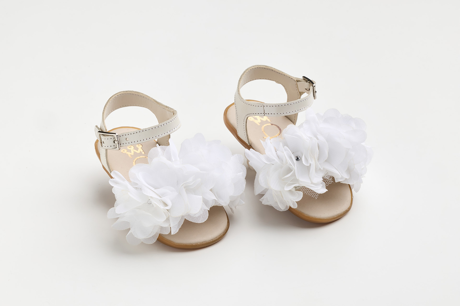 Σανδάλι για τα πρώτα βήματα σε εκρού δέρμα και χειροποίητο off white διακοσμητικό