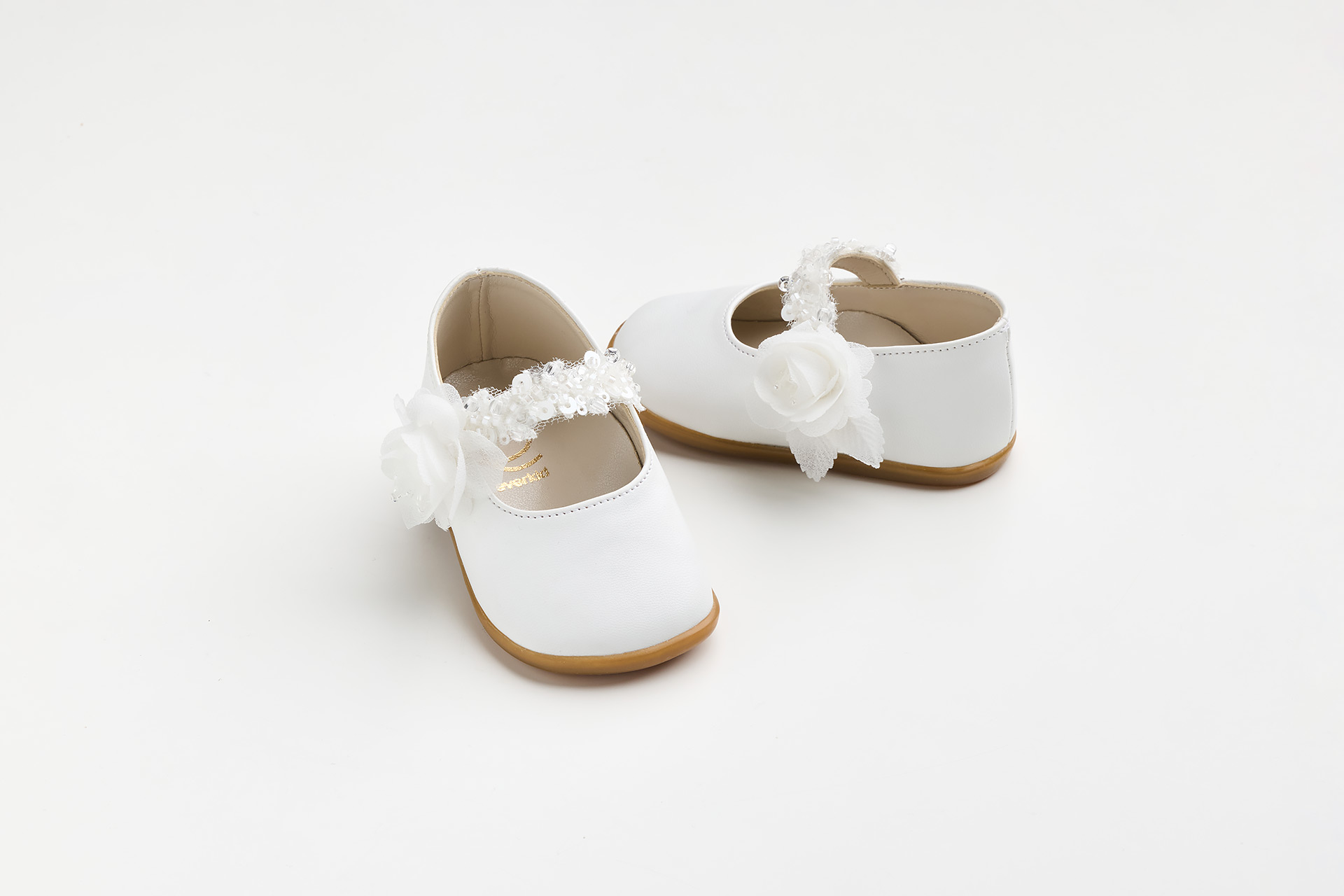 K627A - Μπαλαρίνα για τα πρώτα βήματα σε λευκό τεχνόδερμα με παγιέτες και τριανταφυλλάκι
