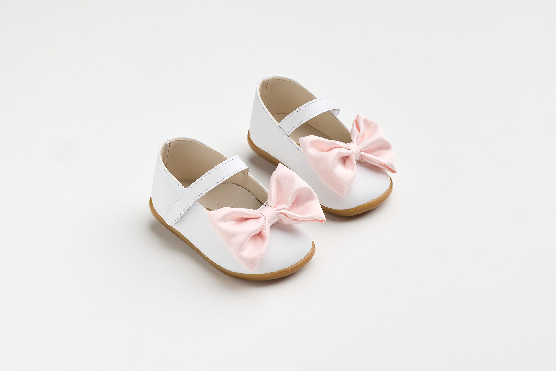 Μπαλαρίνα για τα πρώτα βήματα σε λευκό τεχνόδερμα με ροζ σατέν χειροποίητο φιόγκο