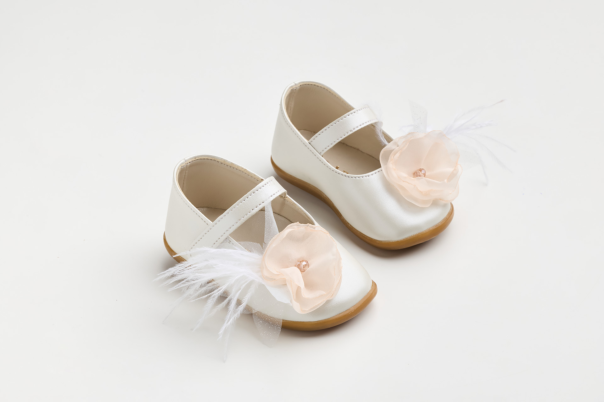 K631B - Μπαλαρίνα για τα πρώτα βήματα σε εκρού τεχνόδερμα με χειροποίητο σομον λουλούδι γκλιτερ τούλι και φτερά