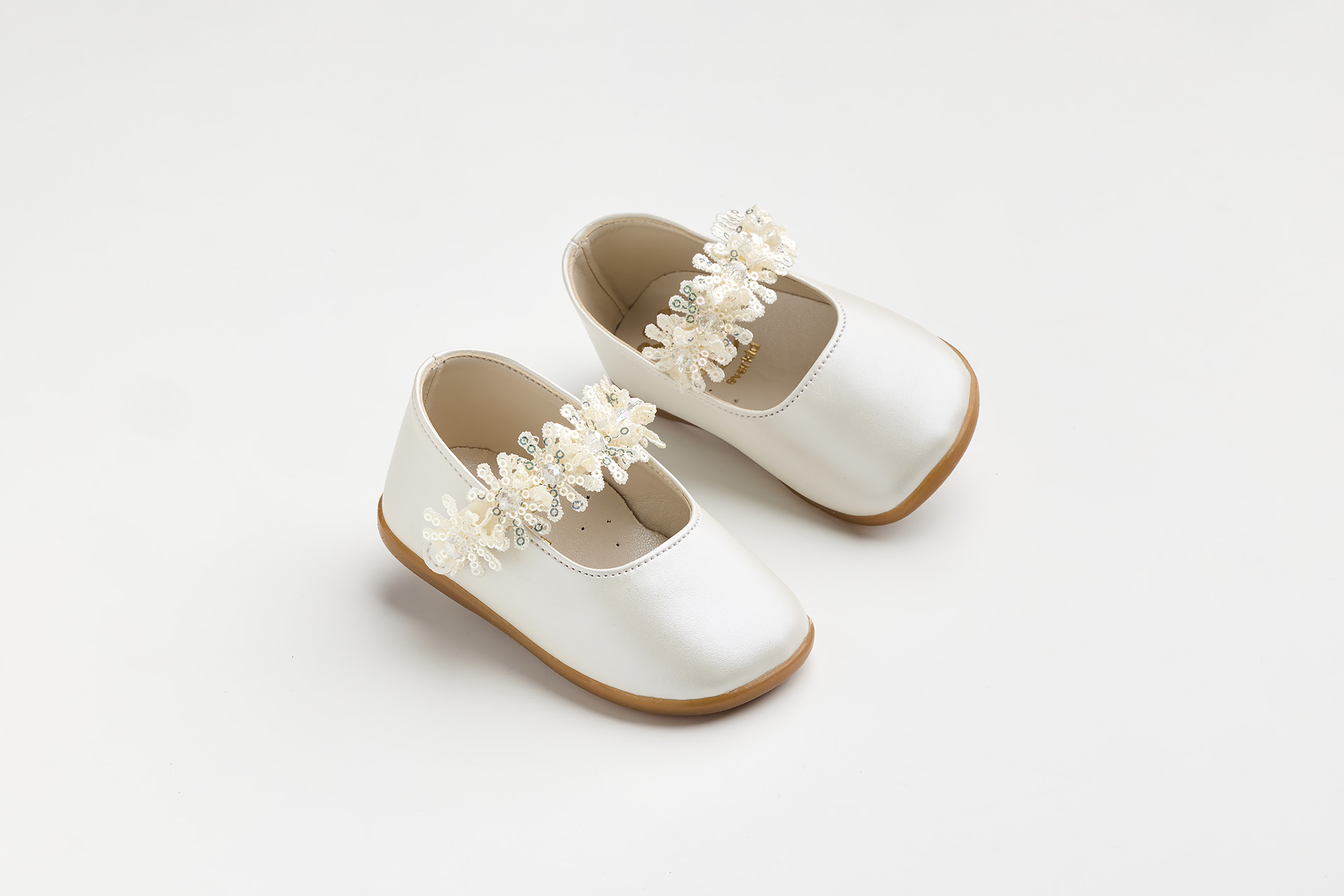 K636E - Μπαλαρίνα για τα πρώτα βήματα σε εκρού τεχνόδερμα με δαντελένια τρέσσα με παγιέτες