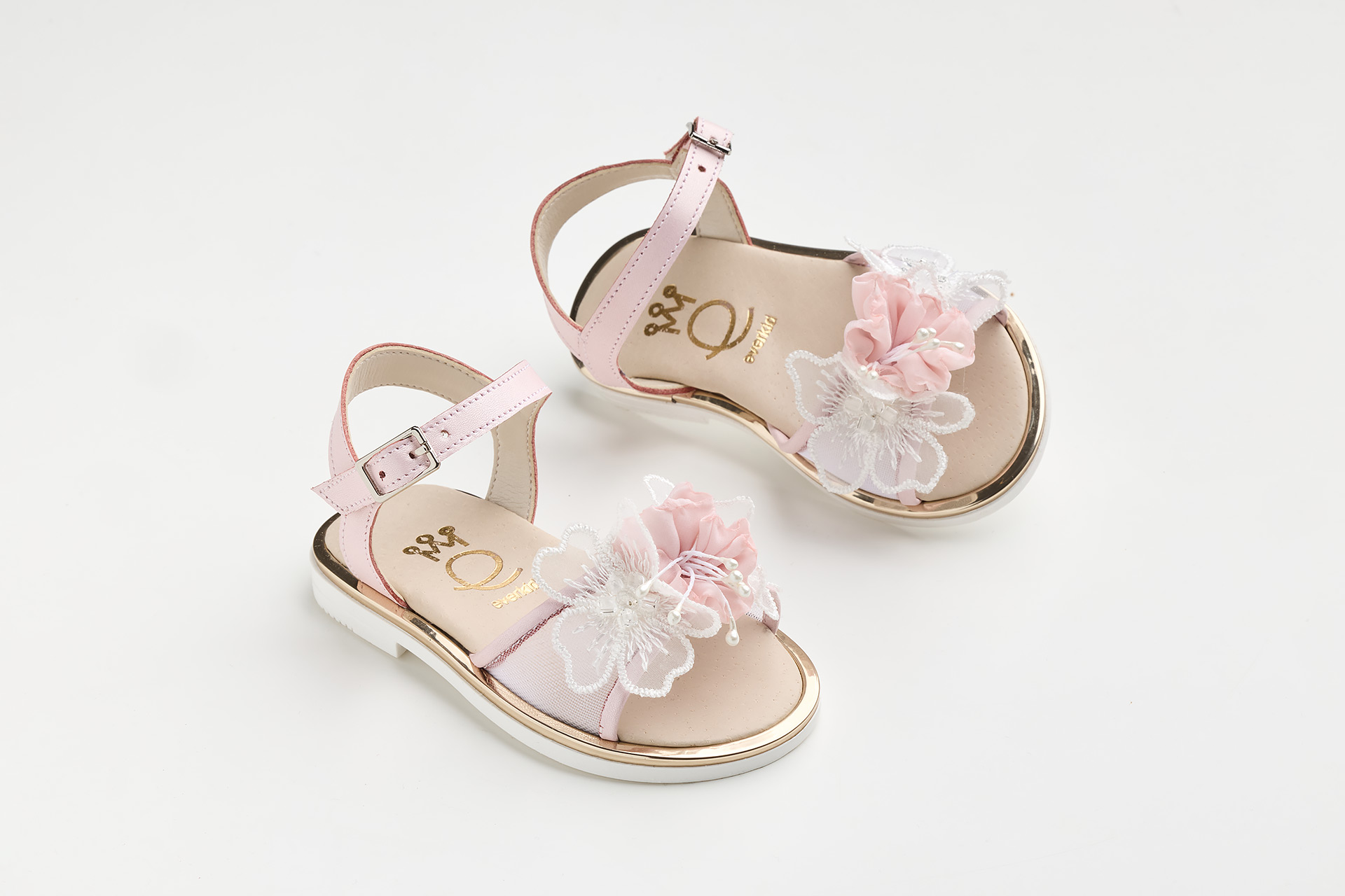 K645E - Σανδάλι περπατήματος σε εκρού δέρμα και διαφάνεια με χειροποίητα λουλούδια σε off white και σάπιο μήλο