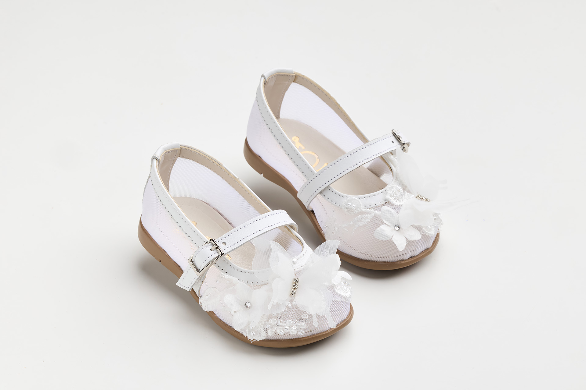 K681A - Μπαλαρίνα περπατήματος σε λευκό δέρμα και διαφάνεια κεντημένη με παγιέτες λουλούδι και πεταλούδα με στρας